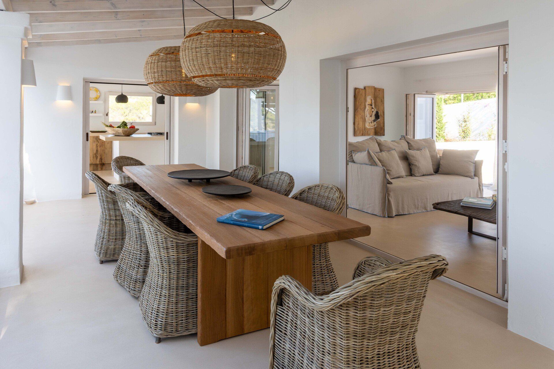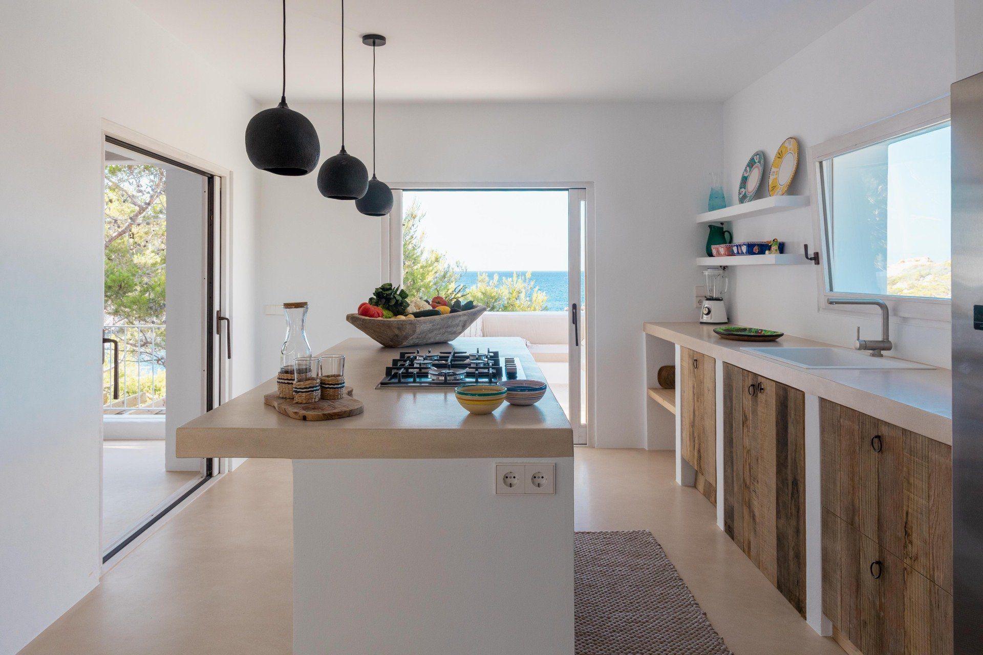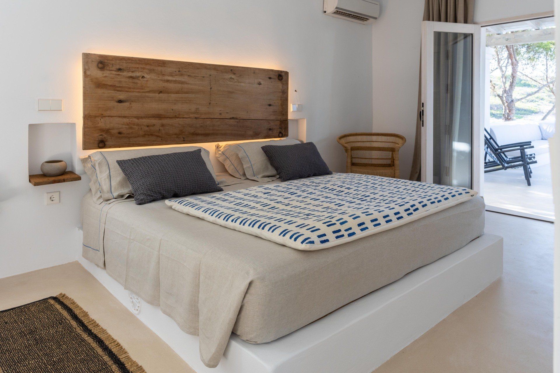 The rustic style of the house is carefully designed in line with its natural surroundings, where each room has its own distinct character and unparalleled views of the crystalline sea.